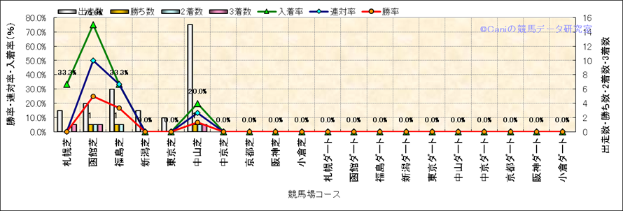 | 2023/7/1 | 函館 | 7 | 芝 | 2000 | 500万 | 14 | 10 | 5 | 1 | 佐々木 大輔 | 51 | 2分02秒3 | 0.2 | 36 | 36.2 | 最内 (8) | 1 | 晴 | 稍重 | 440 | 9.6 | 960 | 230 | |||