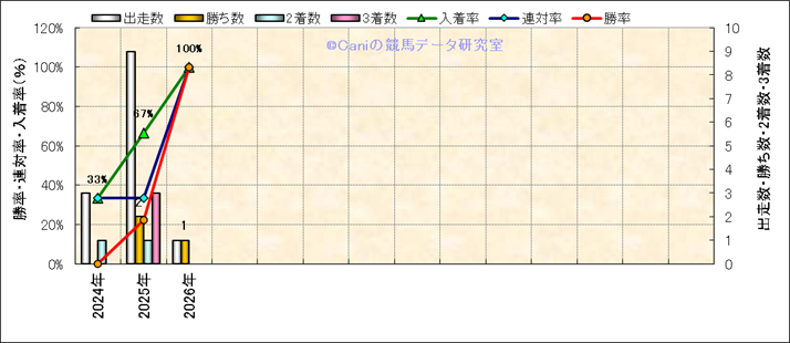 | 2026/1/18 | 中山 | 7 | 芝 | 2200 | 1000万 | 16 | 5 | 5 | 1 | 丹内 祐次 | 57 | 2分14秒5 | 0.2 | 38 | 33.8 | 最内 (2) | 4 | 晴 | 良 | 504 | 15.4 | 1540 | 760 | |||