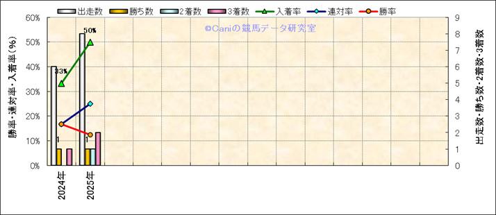 | 2025/8/23 | 中京 | 10 | 芝 | 1600 | 1000万 | 有松特別 | 13 | 6 | 1 | 7 | 松山 弘平 | 58 | 1分33秒9 | 0.4 | 36.9 | 33.7 | 外 (4) | 6 | 晴 | 良 | 500 | 2.7 | 0 | 0 | ||