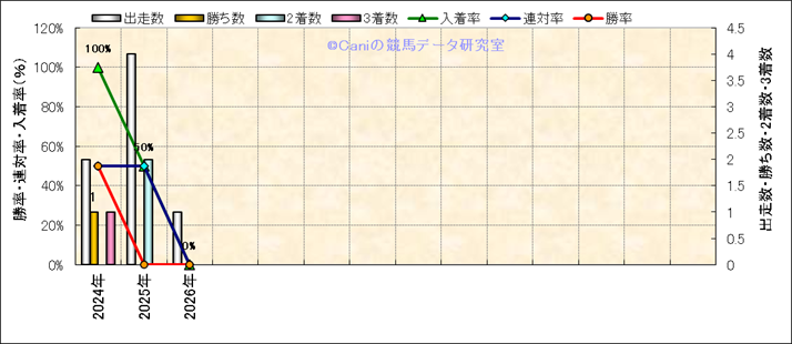 | 2026/1/12 | 中山 | 12 | 芝 | 2000 | 500万 | 18 | 3 | 1 | 5 | 津村 明秀 | 55 | 1分59秒4 | 0.2 | 37.2 | 34.4 | 中 (3) | 7 | 晴 | 良 | 466 | 2 | 0 | 0 | |||