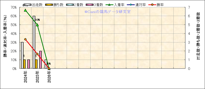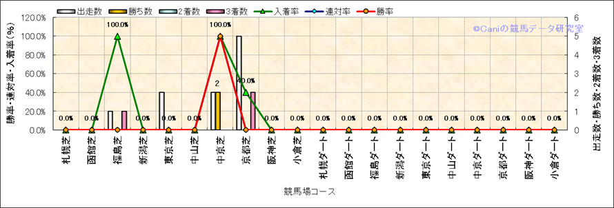 | 2026/1/10 | 京都 | 10 | 芝 | 1200 | 1000万 | 鹿ケ谷特別 | 18 | 5 | 1 | 5 | 岩田 望来 | 57 | 1分08秒4 | 1 | 34.2 | 34.2 | 内 (14) | 5 | 晴 | 良 | 480 | 3.6 | 0 | 0 | ||
