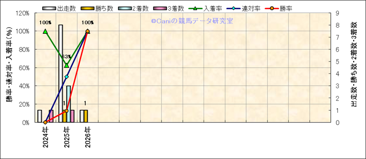 | 2026/1/12 | 中山 | 7 | ダート | 1800 | 500万 | 15 | 1 | 1 | 1 | 菅原 明良 | 55 | 1分53秒8 | 1.2 | 37.6 | 38 | 最内 (2) | 1 | 晴 | 良 | 440 | 2.4 | 240 | 120 | |||
