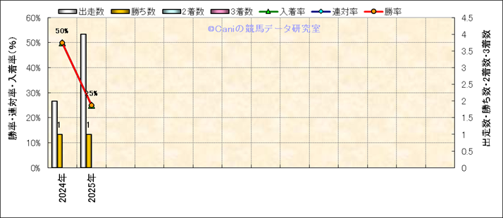 | 2025/4/5 | 阪神 | 11 | 芝 | 1600 | オープン | チャーチルダウン | 11 | 2 | 7 | 7 | 北村 友一 | 57 | 1分32秒8 | 0.6 | 36.1 | 33.8 | 外 (2) | 51 | 晴 | 良 | 494 | 20.9 | 0 | 0 | ||