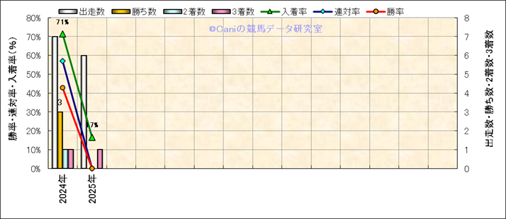 | 2025/12/6 | 中京 | 11 | 芝 | 1400 | 1600万 | 飛騨ステークス | 12 | 8 | 5 | 4 | 菊沢 一樹 | 58 | 1分19秒8 | 0.4 | 34.4 | 34 | 中 (8) | 4 | 晴 | 良 | 478 | 9.8 | 0 | 0 | ||