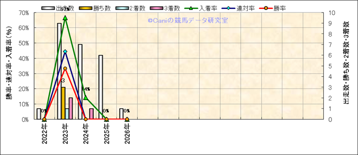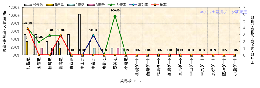 | 最長 | 1400 | 最大 | 58 | 最速 | 33.7 | 33.6 | ()内:上がり順位 | 最大 | 492 | |||||||||||||||||
