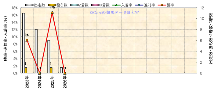 | 2026/1/11 | 中山 | 9 | 芝 | 1800 | 1000万 | 初咲賞 | 13 | 12 | 12 | 11 | 小林 脩斗 | 56 | 1分48秒5 | 0.6 | 38.4 | 35 | 中 (10) | 9 | 晴 | 良 | 488 | 150.9 | 0 | 0 | ||