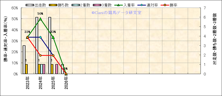 | 2026/1/5 | 中山 | 11 | 芝 | 1200 | 1600万 | サンライズステー | 14 | 10 | 4 | 13 | 津村 明秀 | 55 | 1分09秒7 | 1.5 | 34.2 | 35.5 | 最内 (12) | 9 | 晴 | 良 | 502 | 5.7 | 0 | 0 | ||