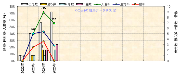| 2025/12/6 | 中京 | 11 | 芝 | 1400 | 1600万 | 飛騨ステークス | 12 | 2 | 2 | 3 | 藤岡 佑介 | 58 | 1分19秒5 | 0.1 | 35.4 | 33.1 | 中 (1) | 8 | 晴 | 良 | 470 | 4.1 | 0 | 150 | ||
