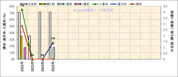 | 2025/3/23 | 中京 | 11 | 芝 | 1400 | オープン | 愛知杯 | 18 | 3 | 18 | 18 | 角田 大和 | 55 | 1分22秒4 | 2.2 | 32.9 | 38.1 | 内 (18) | 2 | 晴 | 良 | 440 | 240.8 | 0 | 0 | ||