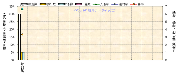 | 2025/8/31 | 中京 | 1 | 芝 | 1400 | 未勝利 | 13 | 6 | 2 | 1 | 松山 弘平 | 55 | 1分21秒3 | 0 | 34.7 | 34.8 | 外 (1) | 11 | 晴 | 良 | 450 | 3 | 300 | 110 | |||
