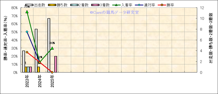 | 2025/5/18 | 新潟 | 10 | 芝 | 2000 | 1000万 | 信濃川特別 | 10 | 4 | 4 | 7 | 菊沢 一樹 | 58 | 2分02秒1 | 0.7 | 37.6 | 34.9 | 中 (4) | 5 | 曇 | 良 | 504 | 6.1 | 0 | 0 | ||