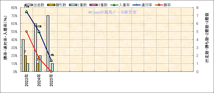 | 2025/12/6 | 中京 | 11 | 芝 | 1400 | 1600万 | 飛騨ステークス | 12 | 9 | 7 | 2 | 丸山 元気 | 58 | 1分19秒4 | 0 | 35.2 | 33.2 | 外 (2) | 6 | 晴 | 良 | 458 | 12.5 | 0 | 350 | ||