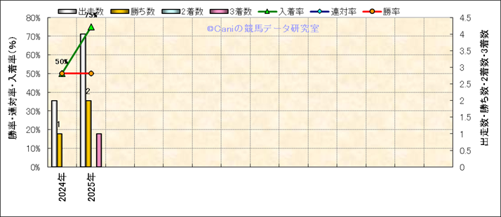 | 2025/8/30 | 札幌 | 10 | ダート | 1700 | 1000万 | 千歳特別 | 14 | 7 | 1 | 1 | 横山 武史 | 55 | 1分42秒9 | 0.4 | 35.6 | 37.4 | 内 (3) | 2 | 曇 | 重 | 508 | 2.4 | 240 | 130 | ||