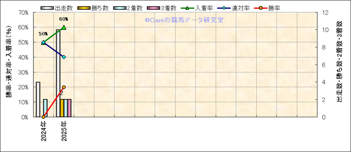 | 2025/9/27 | 阪神 | 6 | ダート | 1800 | 500万 | 13 | 2 | 2 | 2 | J.モレイラ | 55 | 1分52秒7 | 0.2 | 37.5 | 37.7 | 最内 (4) | 1 | 晴 | 良 | 474 | 3.5 | 0 | 150 | |||