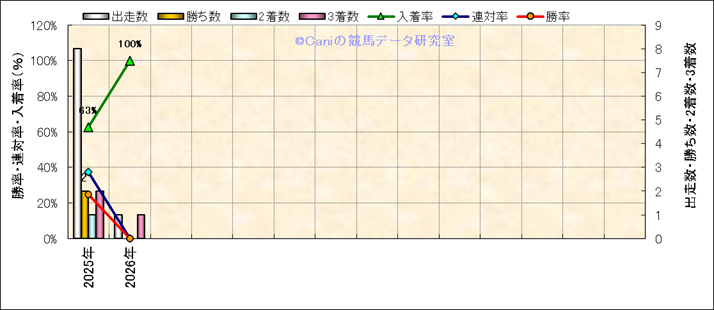 | 2025/11/8 | 福島 | 10 | 芝 | 1200 | 1000万 | 飯坂温泉特別 | 16 | 8 | 2 | 13 | 石川 裕紀人 | 57 | 1分08秒9 | 0.8 | 32.9 | 36 | 最内 (14) | 2 | 晴 | 良 | 484 | 5 | 0 | 0 | ||