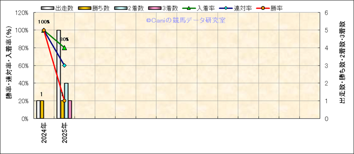 | 2025/4/19 | 阪神 | 5 | 芝 | 2000 | 500万 | 7 | 4 | 3 | 3 | C.ルメール | 57 | 1分58秒9 | 1 | 35.4 | 35.7 | 外 (3) | 4 | 晴 | 良 | 460 | 4 | 0 | 0 | |||