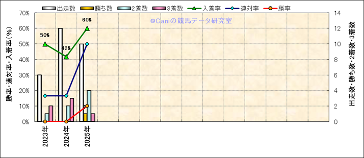 | 2025/11/24 | 福島 | 9 | 芝 | 2600 | 500万 | 磐梯山特別 | 16 | 9 | 5 | 4 | 嶋田 純次 | 58 | 2分40秒2 | 0.4 | 39.5 | 35 | 大外 (1) | 12 | 曇 | 良 | 446 | 10.6 | 0 | 0 | ||