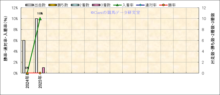 | 2025/2/2 | 京都 | 1 | ダート | 1800 | 未勝利 | 12 | 8 | 7 | 5 | A.ルメートル | 55 | 1分56秒8 | 1.2 | 37.6 | 41 | 中 (6) | 1 | 曇 | 稍重 | 442 | 20.9 | 0 | 0 | |||