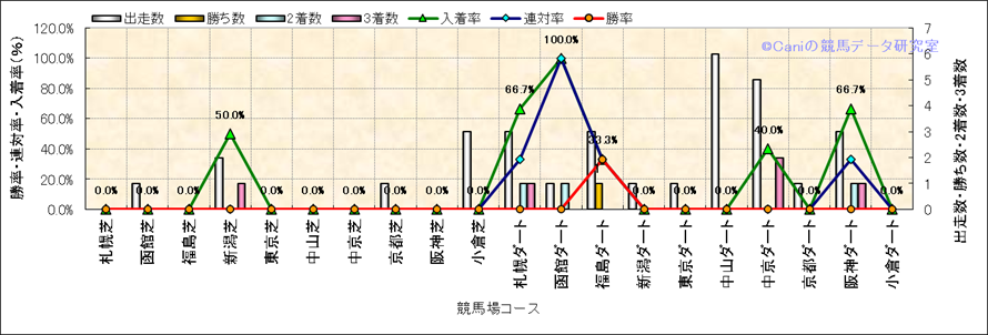| 2023/7/30 | 新潟 | 12 | ダート | 1200 | 1000万 | 15 | 2 | 12 | 15 | 藤田 菜七子 | 56 | 1分14秒2 | 3.4 | 34.1 | 40.1 | 最内 (15) | 4 | 晴 | 良 | 522 | 22.8 | 0 | 0 | |||