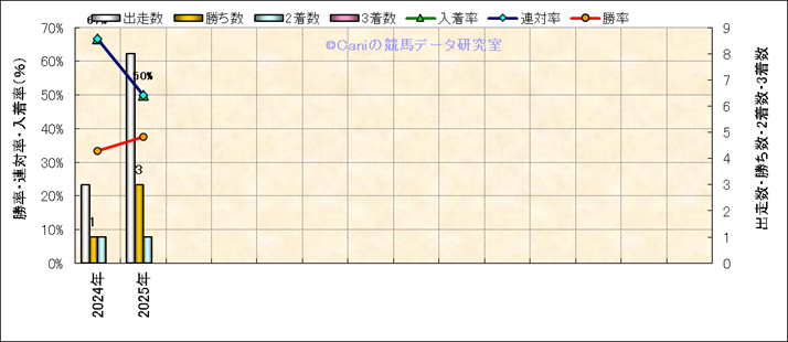 | 2025/6/7 | 阪神 | 10 | ダート | 1800 | 1000万 | 加古川特別 | 9 | 8 | 2 | 1 | 川田 将雅 | 55 | 1分53秒0 | 0 | 39 | 36 | 中 (1) | 2 | 曇 | 良 | 488 | 3.8 | 380 | 120 | ||