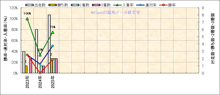 | 2025/5/24 | 京都 | 10 | 芝 | 2000 | 1600万 | シドニーT | 8 | 4 | 1 | 2 | 岩田 望来 | 56 | 2分05秒1 | 0.1 | 39.7 | 34.2 | 内 (5) | 1 | 雨 | 稍重 | 482 | 2.3 | 0 | 110 | ||