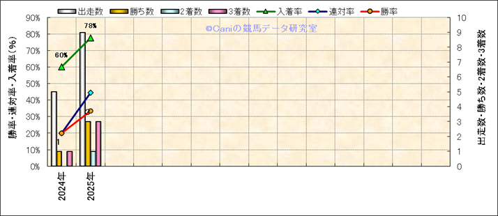 | 2025/4/12 | 中山 | 9 | 芝 | 2000 | 500万 | 山藤賞 | 9 | 6 | 4 | 6 | 菅原 明良 | 57 | 2分01秒7 | 2.7 | 36.4 | 38.1 | 内 (6) | 6 | 晴 | 良 | 488 | 4.5 | 0 | 0 | ||
