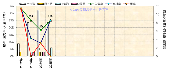 | 2025/4/13 | 中山 | 10 | 芝 | 2000 | 1000万 | 鹿野山特別 | 10 | 5 | 4 | 2 | 横山 和生 | 58 | 2分01秒8 | 0 | 37.6 | 34.8 | 内 (5) | 1 | 雨 | 良 | 500 | 5.6 | 0 | 200 | ||
