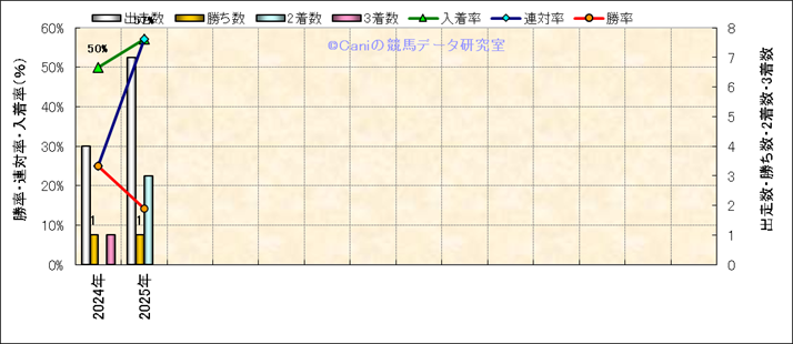 | 2025/9/14 | 中山 | 9 | 芝 | 1600 | 1000万 | 御宿特別 | 8 | 3 | 4 | 5 | 佐々木 大輔 | 54 | 1分34秒0 | 0.5 | 37 | 32.8 | 内 (2) | 6 | 曇 | 良 | 434 | 5.9 | 0 | 0 | ||