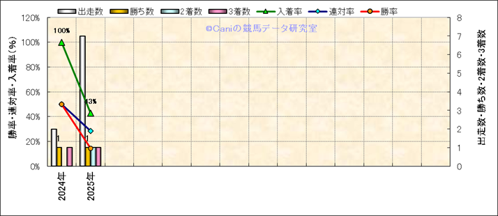 | 2025/8/31 | 新潟 | 8 | 芝 | 2000 | 500万 | 9 | 6 | 2 | 3 | 戸崎 圭太 | 53 | 1分57秒9 | 0.8 | 35.6 | 34.7 | 外 (3) | 2 | 晴 | 良 | 458 | 2.6 | 0 | 100 | |||