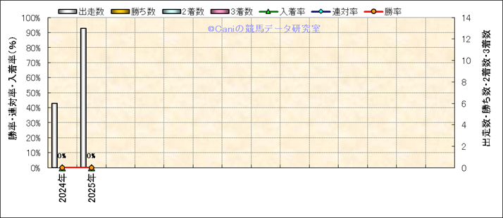| 2025/5/17 | 新潟 | 9 | 芝 | 2000 | 500万 | 尖閣湾特別 | 9 | 4 | 8 | 5 | 長浜 鴻緒 | 58 | 2分03秒4 | 0.2 | 38.3 | 34.9 | 内 (2) | 4 | 曇 | 稍重 | 468 | 64.2 | 0 | 0 | ||