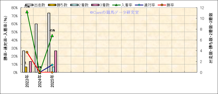 | 2025/11/8 | 京都 | 12 | 芝 | 2000 | 500万 | 14 | 1 | 7 | 5 | 吉村 誠之助 | 57 | 2分01秒4 | 0.5 | 38.6 | 33.9 | 大外 (4) | 13 | 晴 | 良 | 414 | 17.7 | 0 | 0 | |||