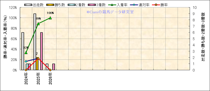 | 2025/7/26 | 札幌 | 3 | ダート | 1700 | 未勝利 | 14 | 5 | 2 | 3 | 横山 武史 | 57 | 1分46秒3 | 0.7 | 37.2 | 38.3 | 外 (1) | 6 | 曇 | 良 | 450 | 3.9 | 0 | 120 | |||
