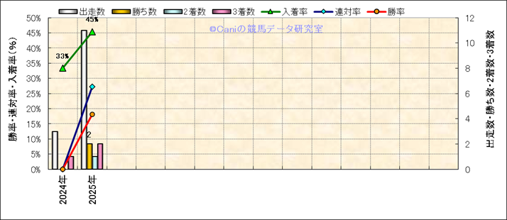 | 2025/2/23 | 京都 | 3 | ダート | 1400 | 未勝利 | 16 | 11 | 11 | 4 | 城戸 義政 | 57 | 1分26秒3 | 0.4 | 35 | 39.1 | 最内 (9) | 1 | 晴 | 良 | 460 | 80.2 | 0 | 0 | |||