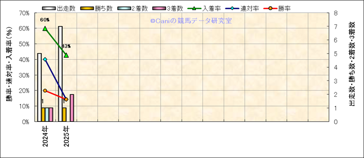 | 2025/3/9 | 阪神 | 4 | ダート | 1400 | 500万 | 16 | 1 | 7 | 15 | 松山 弘平 | 55 | 1分28秒9 | 4.1 | 34.4 | 42.1 | 最内 (16) | 2 | 晴 | 良 | 452 | 15.7 | 0 | 0 | |||