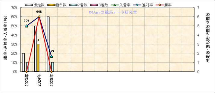 | 2025/5/18 | 東京 | 12 | ダート | 1400 | 1600万 | BSイレブン賞 | 16 | 7 | 7 | 15 | 横山 典弘 | 58 | 1分26秒3 | 3.5 | 39 | 35.8 | 最内 (3) | 15 | 曇 | 重 | 484 | 16.7 | 0 | 0 | ||