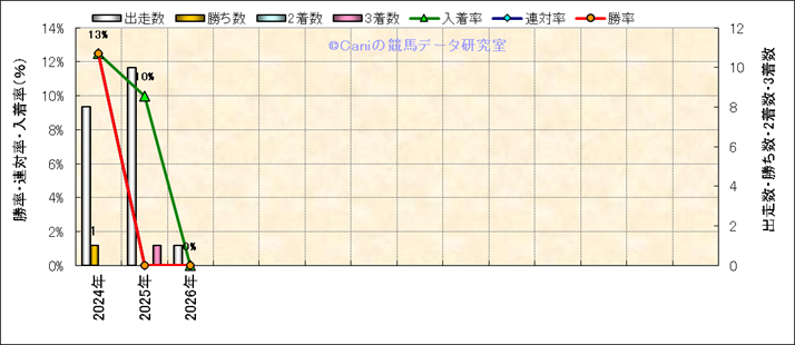 | 2026/1/11 | 中山 | 8 | 芝 | 1600 | 500万 | 16 | 14 | 13 | 5 | 嶋田 純次 | 57 | 1分33秒2 | 1.1 | 35.3 | 35.1 | 最内 (4) | 10 | 晴 | 良 | 486 | 121.7 | 0 | 0 | |||