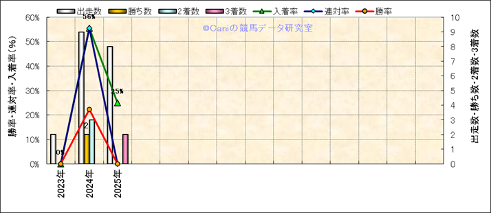 | 2025/12/7 | 中山 | 7 | 芝 | 2500 | 1000万 | 11 | 6 | 10 | 7 | 北村 宏司 | 58 | 2分32秒2 | 1.7 | 37.5 | 35.6 | 最内 (9) | 4 | 晴 | 良 | 454 | 110 | 0 | 0 | |||