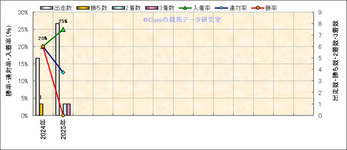 | 2025/9/28 | 阪神 | 9 | 芝 | 2400 | 1000万 | 兵庫特別 | 12 | 10 | 4 | 8 | 秋山 稔樹 | 51 | 2分27秒3 | 1.5 | 40.4 | 34.6 | 外 (8) | 6 | 曇 | 良 | 454 | 12.2 | 0 | 0 | ||