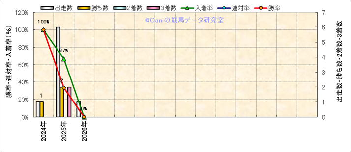 | 2026/1/11 | 京都 | 10 | 芝 | 1600 | 1600万 | 新春ステークス | 15 | 3 | 2 | 7 | 吉村 誠之助 | 57 | 1分33秒7 | 0.9 | 36.6 | 33.8 | 大外 (2) | 10 | 曇 | 良 | 472 | 3.7 | 0 | 0 | ||