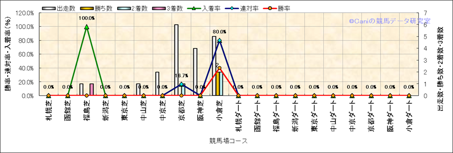 | 2024/6/2 | 京都 | 4 | 芝 | 2000 | 未勝利 | 18 | 16 | 5 | 5 | 鮫島 克駿 | 55 | 2分01秒2 | 0.9 | 36.6 | 35.3 | 最内 (5) | 7 | 曇 | 良 | 444 | 14 | 0 | 0 | |||