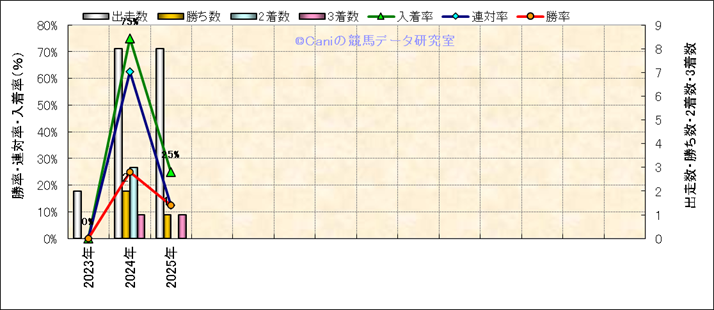| 2025/5/11 | 新潟 | 10 | ダート | 1800 | 1000万 | 五泉特別 | 15 | 9 | 1 | 4 | 丸田 恭介 | 54 | 1分53秒9 | 0.2 | 36.8 | 40 | 中 (11) | 2 | 曇 | 稍重 | 462 | 4.2 | 0 | 0 | ||