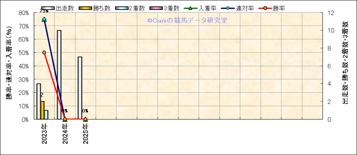 | 2025/3/16 | 中京 | 9 | 芝 | 1400 | 1000万 | 岡崎特別 | 13 | 11 | 8 | 9 | 黛 弘人 | 53 | 1分23秒9 | 1.7 | 35.6 | 36.3 | 内 (6) | 9 | 曇 | 重 | 464 | 22.9 | 0 | 0 | ||