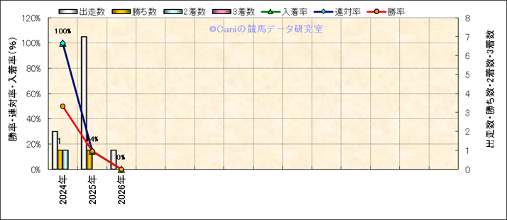 | 2026/1/17 | 中山 | 12 | 芝 | 1200 | 1000万 | 16 | 16 | 11 | 16 | 横山 武史 | 56 | 1分09秒7 | 1.7 | 34.6 | 35.1 | 大外 (16) | 8 | 晴 | 良 | 416 | 29.5 | 0 | 0 | |||