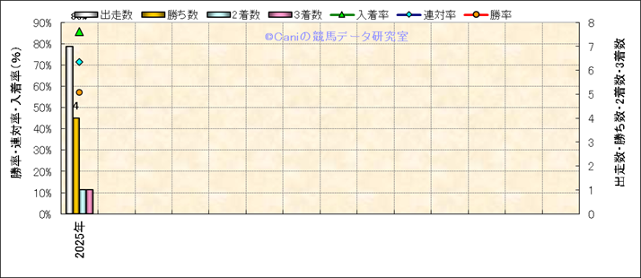 | 2025/7/6 | 函館 | 6 | 芝 | 2000 | 未勝利 | 12 | 4 | 1 | 1 | 丹内 祐次 | 57 | 2分02秒6 | 0.8 | 37.5 | 35.2 | 内 (1) | 3 | 曇 | 稍重 | 504 | 1.6 | 160 | 110 | |||