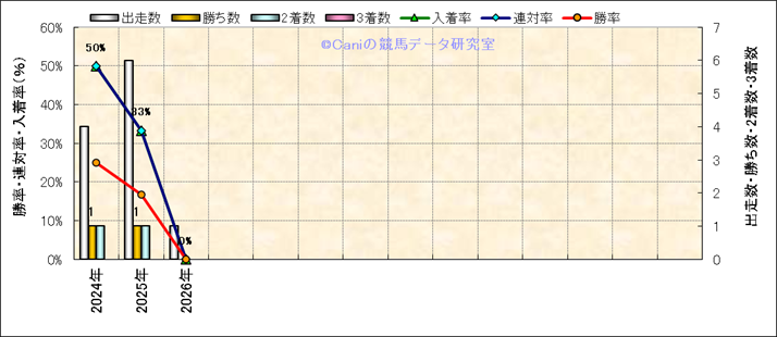 | 2026/1/5 | 中山 | 10 | 芝 | 2000 | 1000万 | 初日の出賞 | 12 | 10 | 2 | 6 | 津村 明秀 | 57 | 2分02秒3 | 0.7 | 37.7 | 34.8 | 外 (7) | 5 | 晴 | 良 | 484 | 3.9 | 0 | 0 | ||