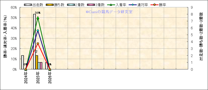 | 2025/11/9 | 京都 | 8 | ダート | 1800 | 1000万 | 16 | 6 | 15 | 6 | 幸 英明 | 54 | 1分50秒4 | 0.7 | 37.8 | 36.4 | 大外 (2) | 9 | 雨 | 重 | 456 | 106 | 0 | 0 | |||