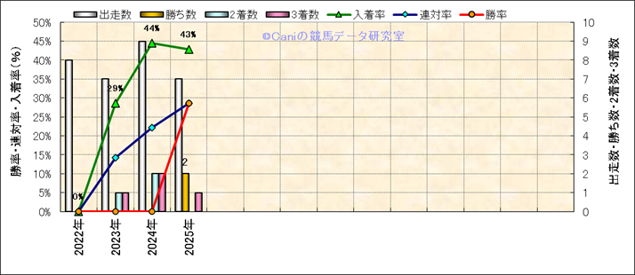 | 2025/9/14 | 阪神 | 9 | 芝 | 2000 | 1000万 | 能勢特別 | 9 | 6 | 4 | 1 | 国分 恭介 | 56 | 2分01秒3 | 0.1 | 38.1 | 34.3 | 最内 (5) | 1 | 曇 | 良 | 434 | 25.1 | 2510 | 160 | ||