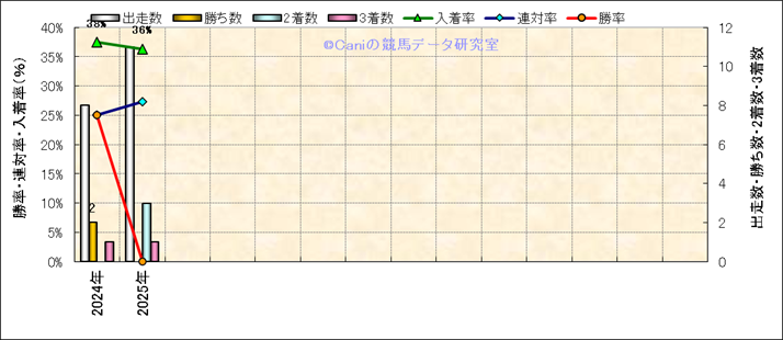 | 2025/1/19 | 中山 | 8 | 芝 | 1800 | 1000万 | 14 | 1 | 13 | 10 | 小林 脩斗 | 55 | 1分49秒2 | 0.9 | 37.8 | 35.3 | 最内 (11) | 4 | 曇 | 良 | 528 | 92.5 | 0 | 0 | |||