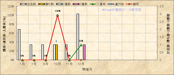 | 2026/1/11 | 中山 | 8 | 芝 | 1600 | 500万 | 16 | 4 | 9 | 6 | 津村 明秀 | 55 | 1分33秒2 | 1.1 | 33.8 | 36.4 | 最内 (8) | 1 | 晴 | 良 | 452 | 42.6 | 0 | 0 | |||