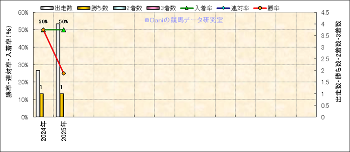 | 2025/7/13 | 函館 | 7 | 芝 | 1800 | 500万 | 14 | 1 | 1 | 1 | 横山 武史 | 53 | 1分46秒6 | 0.1 | 35.3 | 34.9 | 内 (9) | 2 | 晴 | 良 | 472 | 1.8 | 180 | 120 | |||